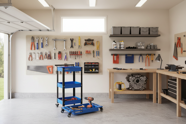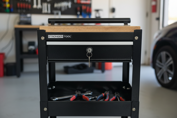 I was surprised by how thick the steel is, it feels very sturdy. The Black colour blends in perfectly with my existing tool cart in the garage. I was lucky to get free shipping because the box was bigger than I expected. I keep it under a shelf unit with the tools I use most when I’m lying on the floor working on my car at home. Very practical.