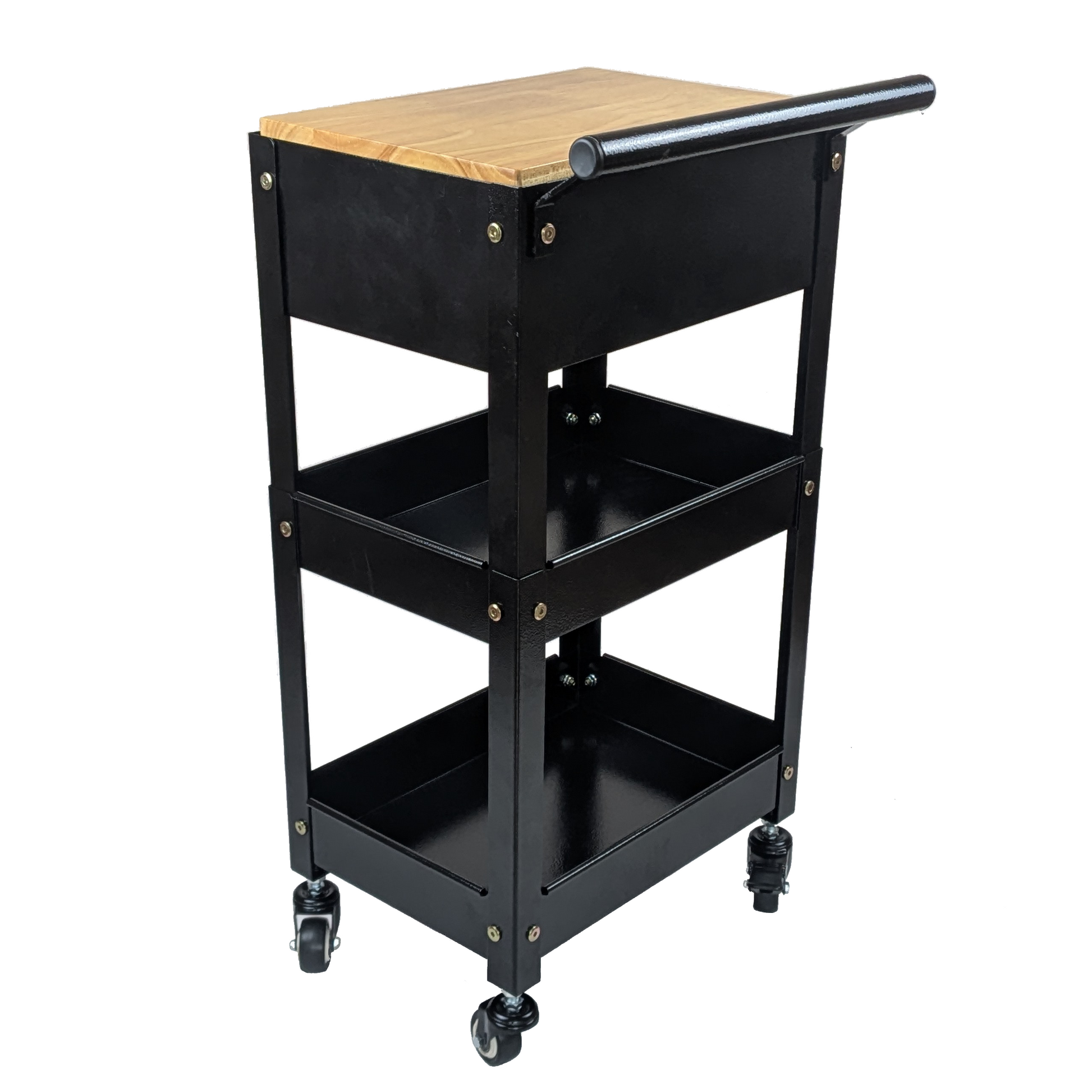 Xe đẩy tiện ích 3 tầng nhỏ gọn này được thiết kế để dễ dàng sắp xếp đồ đạc trong các tiệm làm móng, tiệm làm tóc, xưởng và không gian gia đình. Được chế tạo từ thép sơn tĩnh điện bền bỉ, xe mang lại sự ổn định tuyệt vời và khả năng di chuyển mượt mà, đồng thời vẫn giữ được vẻ ngoài gọn gàng, tối giản. Ba khay sâu cung cấp không gian lưu trữ rộng rãi cho dụng cụ, chai lọ, phụ kiện và các vật dụng thiết yếu hàng ngày, trong khi tay cầm tích hợp giúp dễ dàng di chuyển trong không gian chật hẹp. Kết cấu chắc chắn và thiết kế gọn gàng giúp xe trở thành một phụ kiện thiết thực và bền bỉ cho bất kỳ không gian làm việc chuyên nghiệp hay gia đình nào.